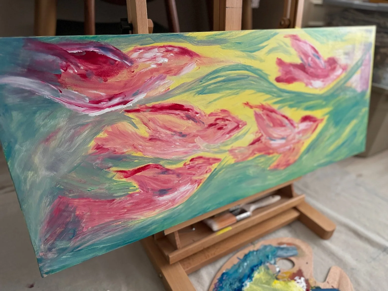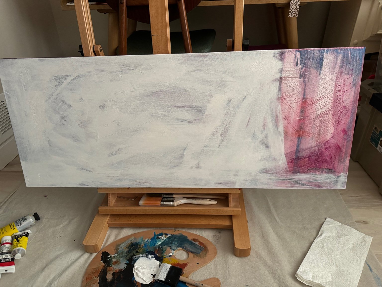 Weeks later, the Holy Spirit gave new instruction: paint over it, but leave the right side untouched — the area representing the New Jerusalem and purpose. Layer by layer, I obeyed, covering what was dark with white, then light, then life. As I followed His direction, something new emerged — forms like birds in motion, each distinct yet moving in unity, caught in the same current of wind.